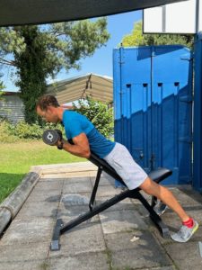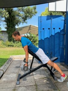 Hantelbank auf ca. 30 Grad stellen. Mit der Brust auf die schräge Rückenlehne legen und Arme hängen lassen. Deine Handgelenke sind gerade.