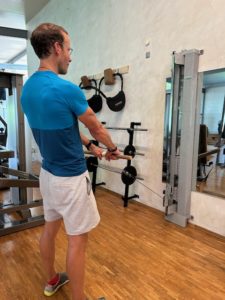 Die Hantelscheibe schnürst du an das Seil und das andere Ende des Seils an die Kurzhantelstange. Arme auf Brusthöhe ausstrecken und die Hantelscheibe am Seil langsam nach oben aufrollen und langsam wieder abrollen.